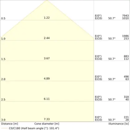 De gradenbundel geeft informatie over hoe breed het licht wordt uitgestraald. Dit zit tussen de 0 en 360 graden (D). Hoe kleiner de hoek, hoe specifieker de lichtbundel is. Over het algemeen is een smalle gradenbundel perfect voor sfeer- of accentverlichting, terwijl een brede gradenbundel ideaal is om grote oppervlaktes te verlichten.