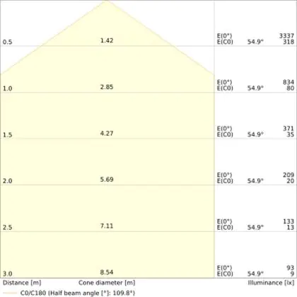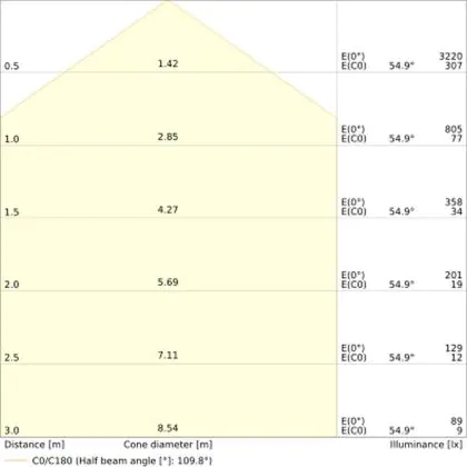 De gradenbundel geeft informatie over hoe breed het licht wordt uitgestraald. Dit zit tussen de 0 en 360 graden (D). Hoe kleiner de hoek, hoe specifieker de lichtbundel is. Over het algemeen is een smalle gradenbundel perfect voor sfeer- of accentverlichting, terwijl een brede gradenbundel ideaal is om grote oppervlaktes te verlichten.