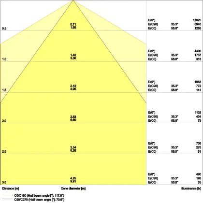 De gradenbundel geeft informatie over hoe breed het licht wordt uitgestraald. Dit zit tussen de 0 en 360 graden (D). Hoe kleiner de hoek, hoe specifieker de lichtbundel is. Over het algemeen is een smalle gradenbundel perfect voor sfeer- of accentverlichting, terwijl een brede gradenbundel ideaal is om grote oppervlaktes te verlichten.