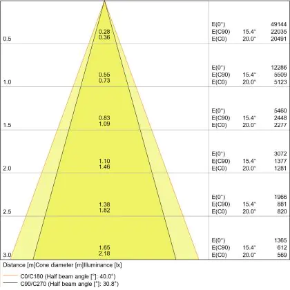 De gradenbundel geeft informatie over hoe breed het licht wordt uitgestraald. Dit zit tussen de 0 en 360 graden (D). Hoe kleiner de hoek, hoe specifieker de lichtbundel is. Over het algemeen is een smalle gradenbundel perfect voor sfeer- of accentverlichting, terwijl een brede gradenbundel ideaal is om grote oppervlaktes te verlichten.