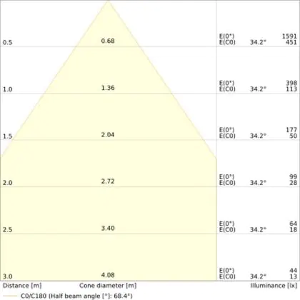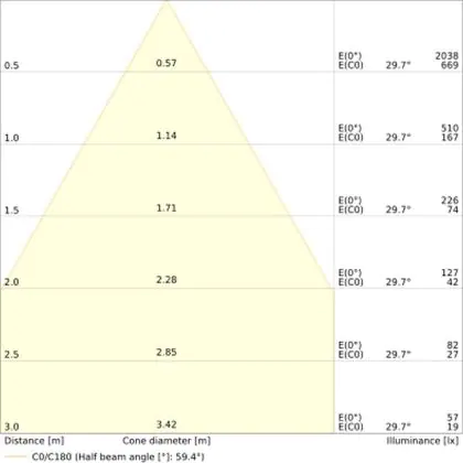 De gradenbundel geeft informatie over hoe breed het licht wordt uitgestraald. Dit zit tussen de 0 en 360 graden (D). Hoe kleiner de hoek, hoe specifieker de lichtbundel is. Over het algemeen is een smalle gradenbundel perfect voor sfeer- of accentverlichting, terwijl een brede gradenbundel ideaal is om grote oppervlaktes te verlichten.